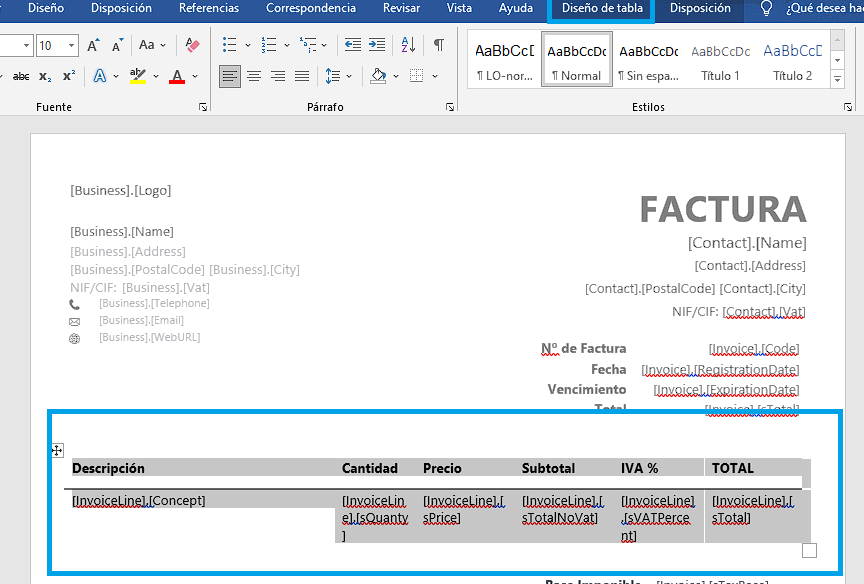 En este ejemplo se ha creado una tabla con dos filas: la primera con la cabecera y la segunda con los cámpos dinámicos de líneas de factura.